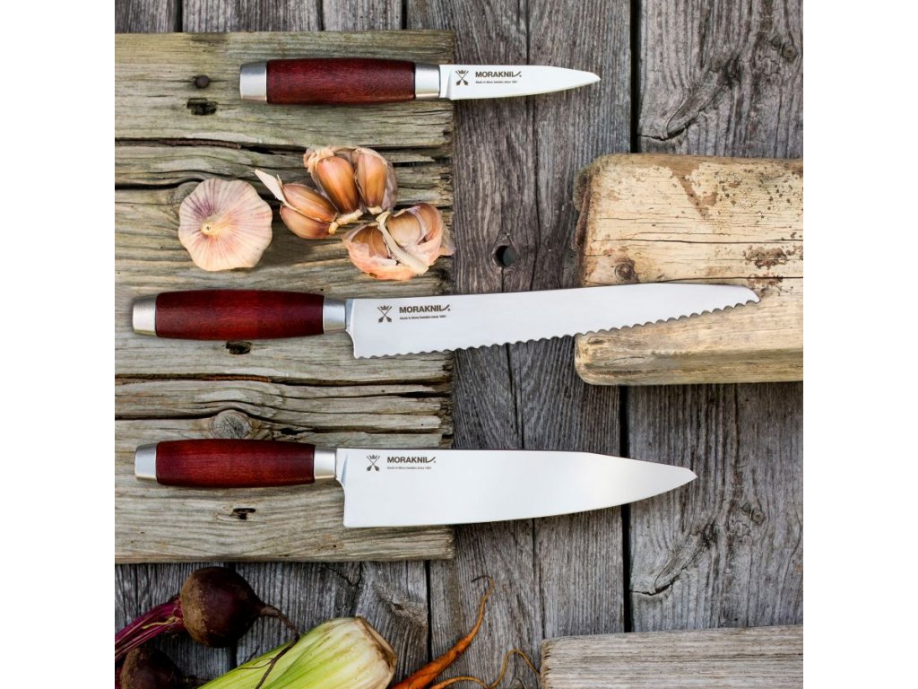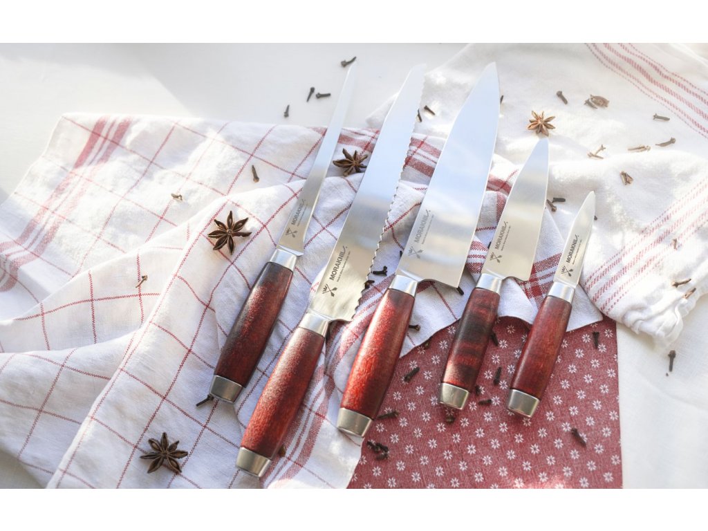 Tvar rukojeti je připodobněním klasických nožům Morakniv, ale je speciálně uzpůsobený pro práci v kuchyni.
