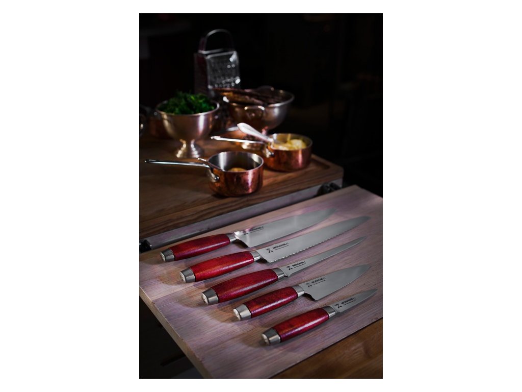 luxusní chlebový nůž 371mm s červenou březovou rukojetí a dlouhou, ozubenou nerezovou čepelí, která je postupně zakřivená a díky tomu nůž snadno dokáže projít křupavou kůrkou celého bochníku chleba - původní provedení