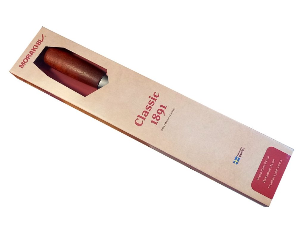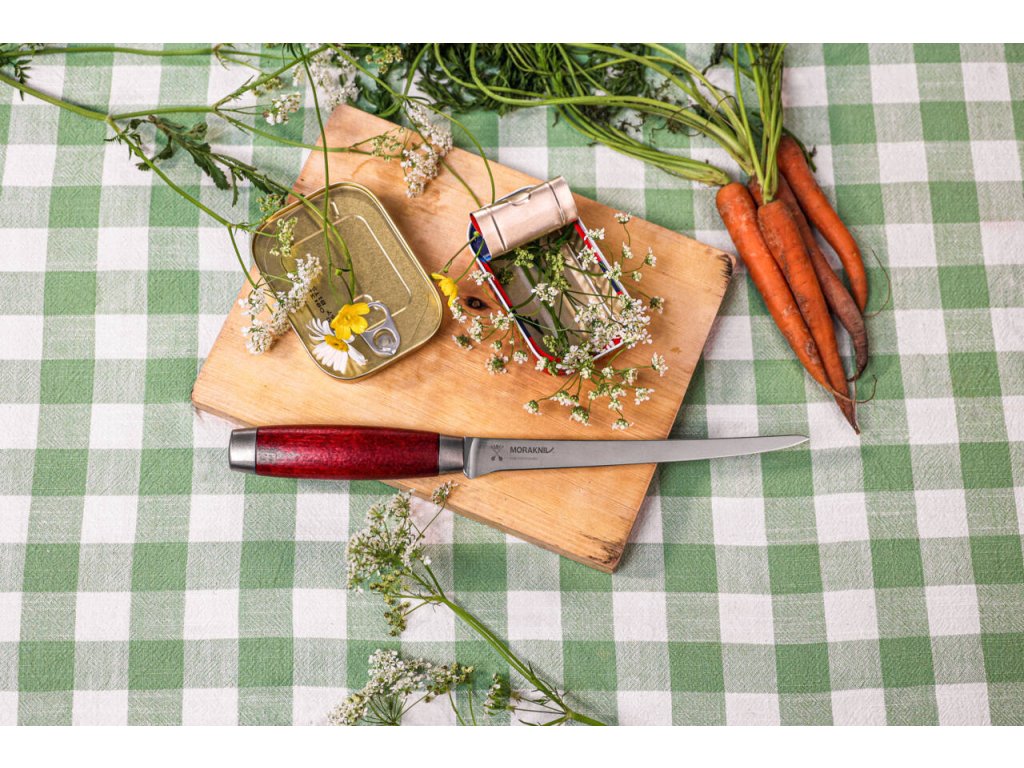 luxusní filetovací nůž v rustikálním vzhledu ze série Morakniv Classic 1891 s leštěnou superflexibilní čepelí 188mm ze švédské nerezové oceli 12C27, precizním kováním s vyrytým erbem na stylové soudkovité rukojeti z červené švédské břízy a dárkovým boxem