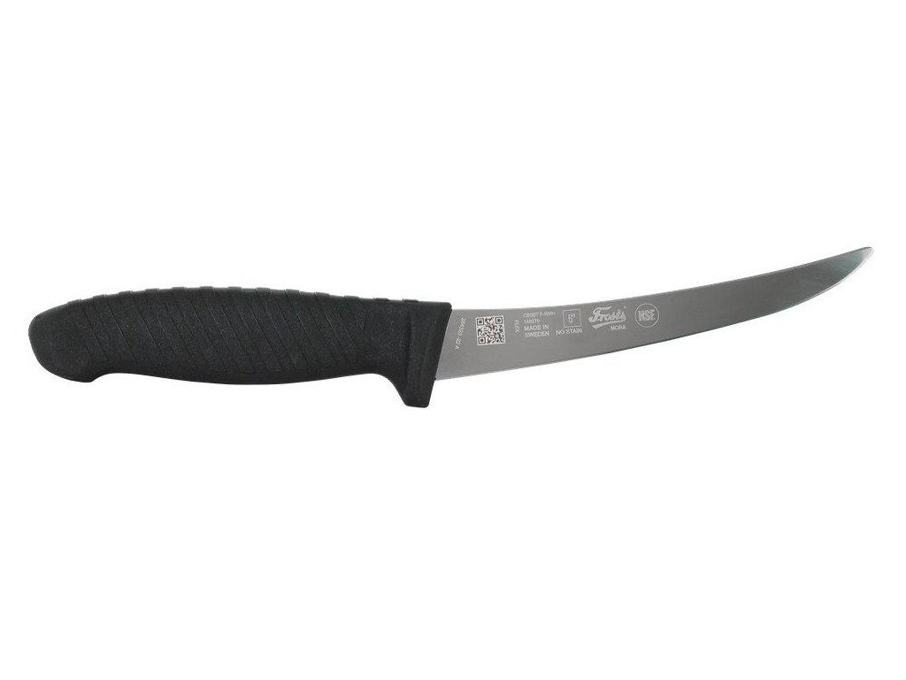 vysoce kvalitní vykošťovací nůž FROST® RMH od Morakniv se zakřivenou flexibilní čepelí 155mm s tupou špičkou ze švédské nerezové oceli, černou ergonomickou rukojetí z polyamidu se speciálním protiskluzovým žebrováním a trasovacím QR kódem